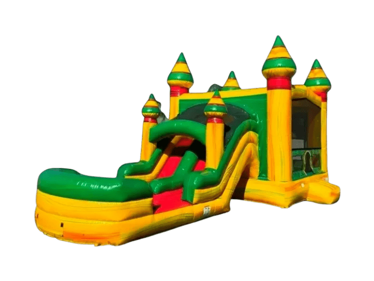 ALOHA FALLS DUAL LANE (WET/DRY) Bright, tropical-themed fun for any party — the Aloha Falls Dual Lane (Wet/Dry) is a combo unit that blends a roomy bounce area with two side-by-side slide lanes so more kids can play at once. Built with a colorful island palette of green, yellow and red, it features a screened bounce house for safe jumping and visibility, plus dual slides that converge into a splash pool for wet use or a cushioned landing for dry events. With two lanes, supervised racers can take turns without long waits, and the covered entry over the slides gives extra shade and a playful archway. Ideal for backyard parties, school events, or community gatherings, this rental delivers high-energy entertainment while keeping safety and easy setup in mind.