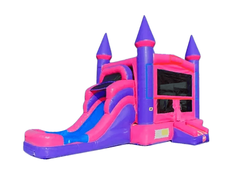 Bring a burst of candy-colored fun to your event with the Sugar Rush Single Lane (Wet/Dry)—a bright pink-and-purple combo unit that pairs a roomy bounce area with a single, swooping slide you can use wet or dry. Kids enter the secure, mesh‑screened bounce house to jump and play, then climb the interior ramp and glide down the cushioned slide into a splash-ready landing or a soft dry pad. The castle‑style turrets and vivid colors make it a showpiece for birthday parties, family gatherings, school events, or backyard celebrations, while the mesh walls keep play visible and ventilated for adult supervision. Designed for easy setup and versatile use, this unit offers energetic, safe playtime that’s perfect for little sugar lovers who want a lively mix of bouncing and sliding.